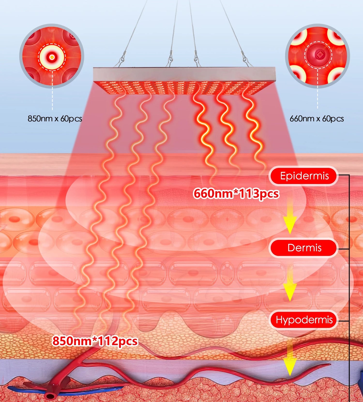 660nm red light targets the surface layer of skin for beauty benefits, while 850nm penetrates deeper to promote healing and reduce inflammation.